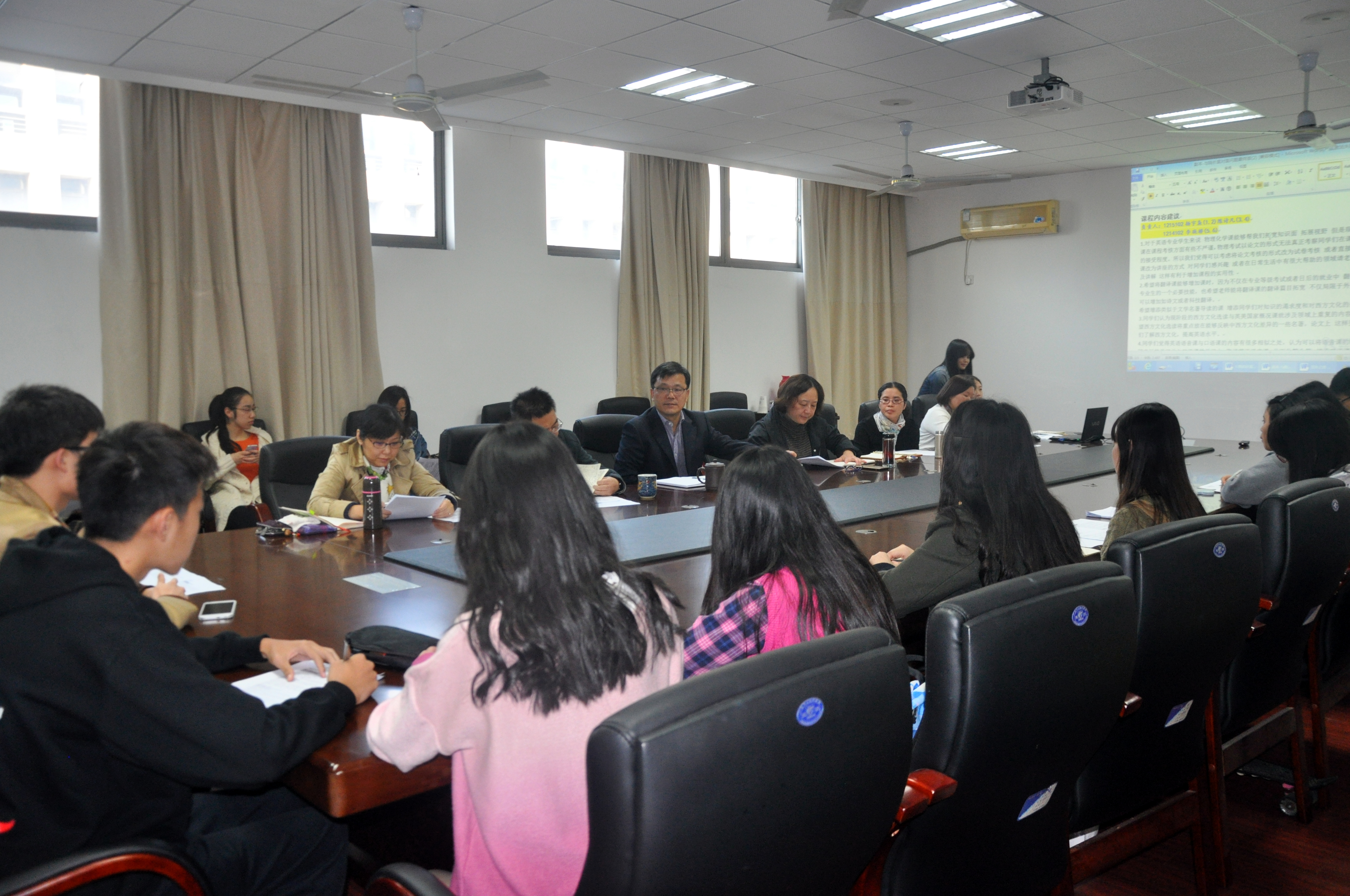 经过前期广泛的意见征集与整理,学生代表们围绕师生共同关注的课程设置、课堂教学、专业分流、本科生导师制、实习实践安排、国际化发展等话题踊跃发言,分享了现状调查结果和同学们的意见、建议。在课程设置上,英语专业学生代表提出了部分课程内容上略有重复,日语专业学生建议低年级的专业课程应有所增加;在课堂教学上,有同学建议部分老师的课堂安排更加合理,课程考核方法需提前明确等问题;对于学院即将实施的本科生导师制,学生代表们在导师的选择方法、考核方式等方面提出了具体建议;在国际化发展上,同学们期待学院多争取适合万象城官网学生的交换项目,更加支持模拟联合国大会等国际性活动,并有机会开展与留学生的交流活动;大四学生代表也积极提出希望得到学院更加合理地安排课程时间以利于学生进行有针对性的、高质量的实习等建议。