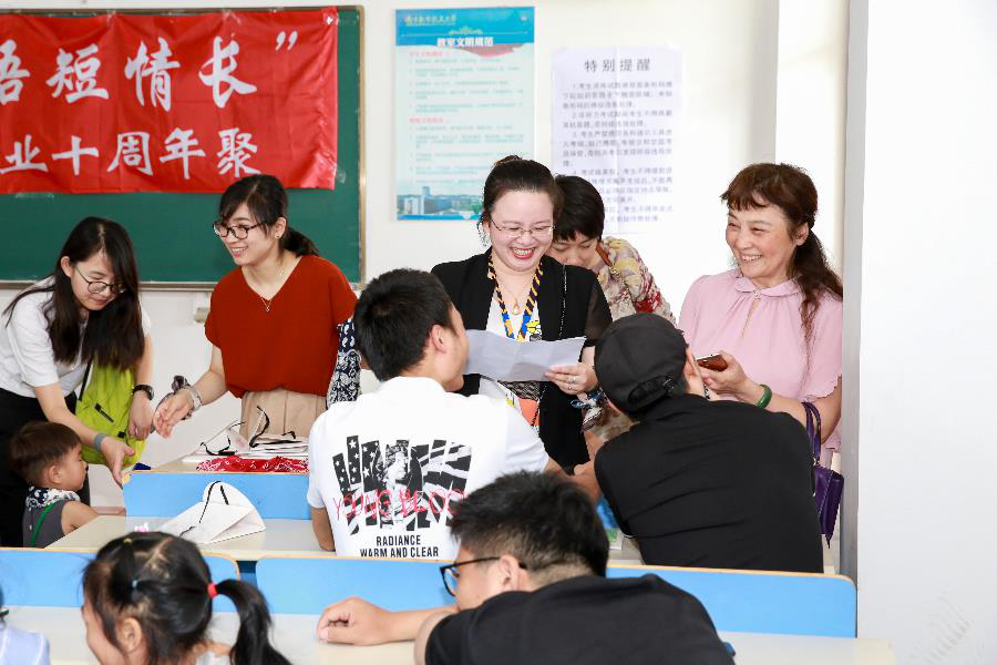 雏鸟振翅,十载高远。这群2004年9月份入学的日语系学子们在十年前的夏天分别,如今趁着假期带着家人孩子和彼此的挂念从各地赶来,回到了当初一起上课的教室里欢聚一堂,重温校园时光。