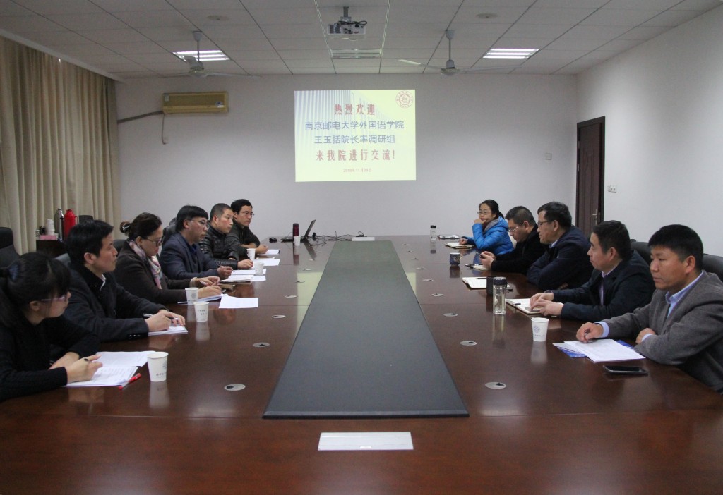 下午,南京邮电大学万象城allwincity官网李炯英副院长带领调研组6人来院调研。院长范祥涛、副院长刘长江、徐以中,日语系主任窦硕华,教学部主任黄潜参加了调研会。