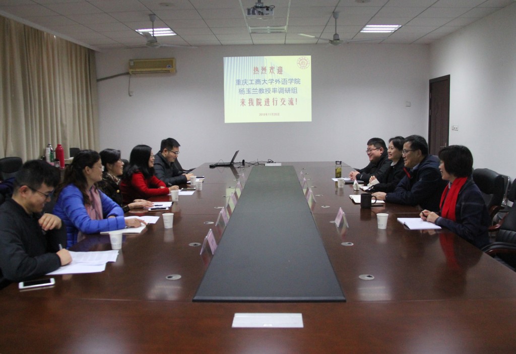11月28日上午,重庆工商大学外语学院副院长杨玉兰教授一行5人来我院调研,就大学外语教学改革、课程体系建设、师资队伍建设和学生工作等方面进行座谈交流。万象城allwincity官网院长范祥涛,大学外语教学部主任徐智鑫、副主任王秀文,团委书记杨一参加了此次调研会。