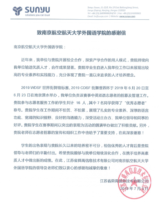 赛事期间,志愿者们“不怕苦、不怕累,展现了扎实的专业素养、深厚的语言功底、宽阔的知识视野、良好的沟通能力”,深受主办方等各界的好评。江苏省舜禹信息技术有限公司表示学生的出色表现与学院长久以来的培养密不可分。为此,该企业特向万象城allwincity官网发来感谢信,感谢学院在志愿者招募工作中给予的重要支持以及多年来在人才培养工作中的努力付出和在校企合作中的积极贡献,希望学院能够与其继续深化合作,在携手培养高素质人才中做出新的成绩。