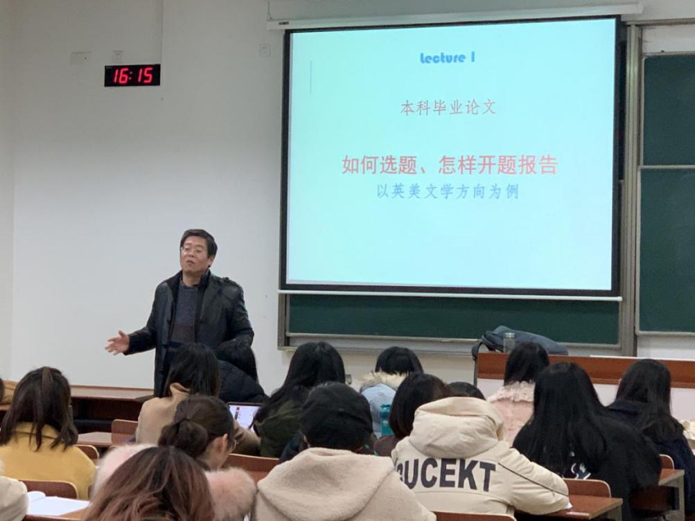 作为文学领域的专家,蔡咏春教授以英美文学方向论文为例,向同学们介绍了本科生毕业论文写作的主要方法与注意事项。首先,蔡老师提纲挈领地介绍了撰写论文需要经历的几个步骤,告诫大家选题切忌泛、大、陈、浅,尽量做到新、齐、全。论文选题应以兴趣为前提,从小题着手,寻找新信息、新角度,客观、理智地选题,达到文贵出新的效果。