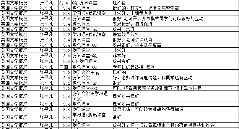 后续选修课中,以英国文学概况这门课为例,课程组刘世红和张平凡这两位擅长在线教学工具的搭档,不断对比取舍,各自度身定制了主播套餐:①QQ群:联系学生发布信息上传资料;②超星教学平台:建课,明确每个章节的学习目标,各个节点都提供相对应的学习资料,如课本电子版(学生都没有课本)、录屏课件、电子参考读物、相关音频视频、PPT、电子书等,方便进行课上课下的多种学习活动;③腾讯会议(刘世红):进行课堂教学,优势在于满足课堂师生语音和屏幕分享的互动需要,并且操作界面简单清晰;④腾讯课堂(张平凡):进行课堂教学,课堂可以录屏回放,且不占空间。
