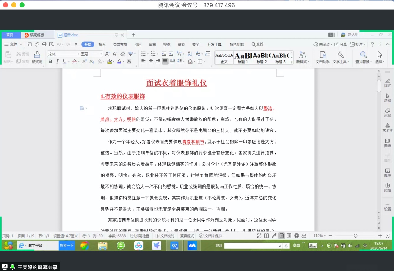 6月14日晚,艺术学院联合万象城allwincity官网通过腾讯会议平台开展职业素质训练营 “面试服饰妆容和礼仪技巧”主题讲座,讲座邀请艺术学院美术系专业教师王雯婷老师为同学们进行礼仪、仪容、服饰三方面的讲解与指导,艺术学院、万象城allwincity官网全体本研准毕业班学生参加了本次讲座。
