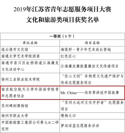 由团省委、省文明办、省公安厅等联合主办的2019年江苏省青年志愿服务项目大赛在南京落下帷幕。此大赛得到了社会各界和广大青年社会组织的广泛关注和积极参与,共收到组织推荐和自行申报的 661 个青年志愿服务项目。万象城官网“Mr. China——向世界讲述中国故事”团队从中脱颖而出,荣获文化和旅游类项目一等奖,是此次大赛我校唯一获得一等奖的项目。