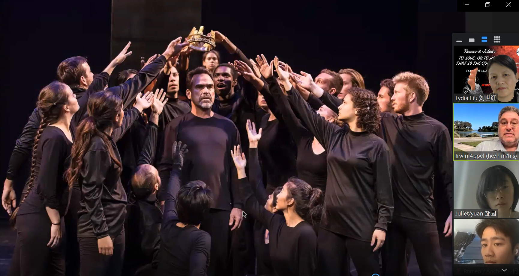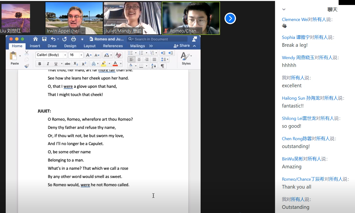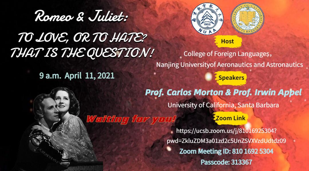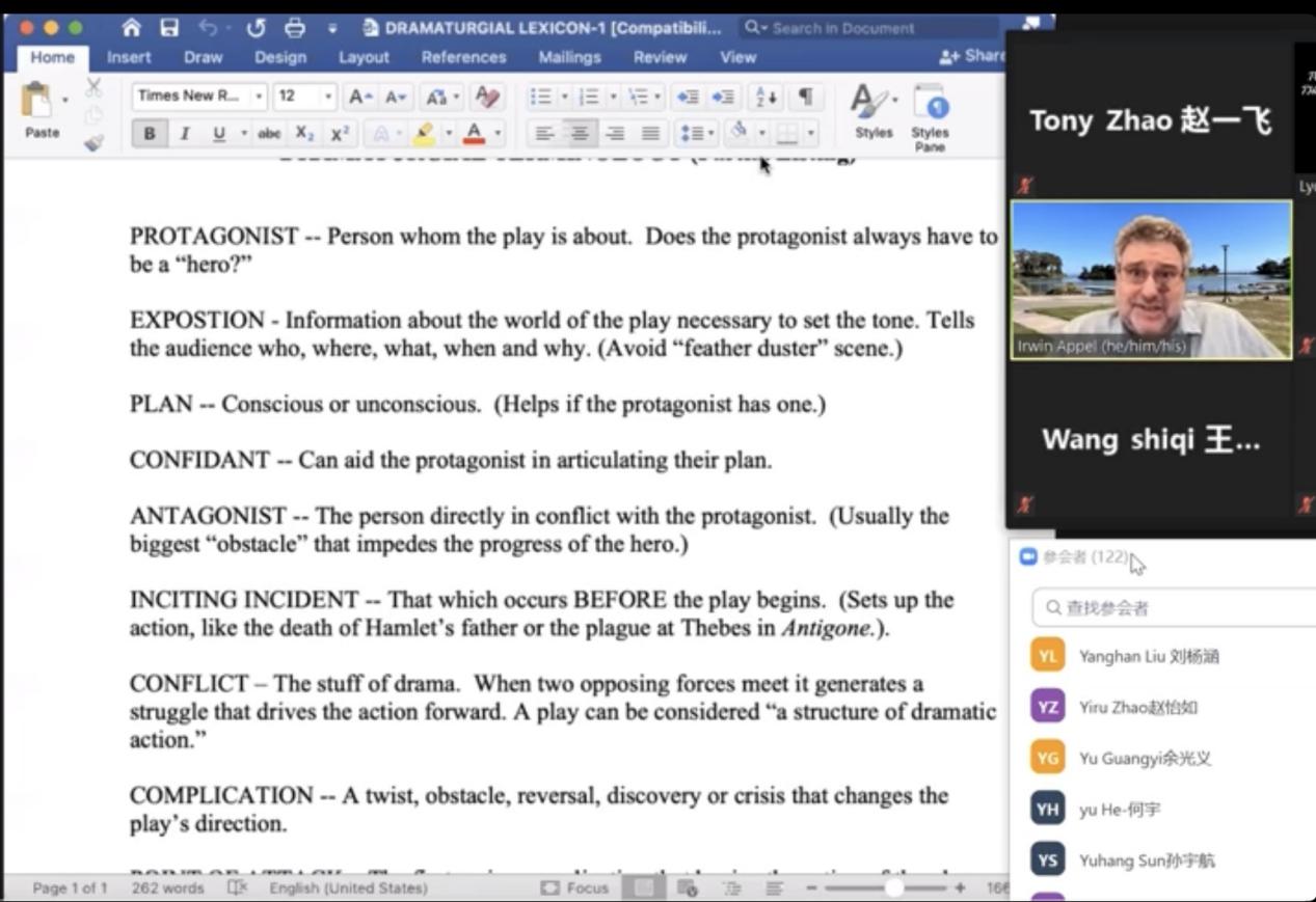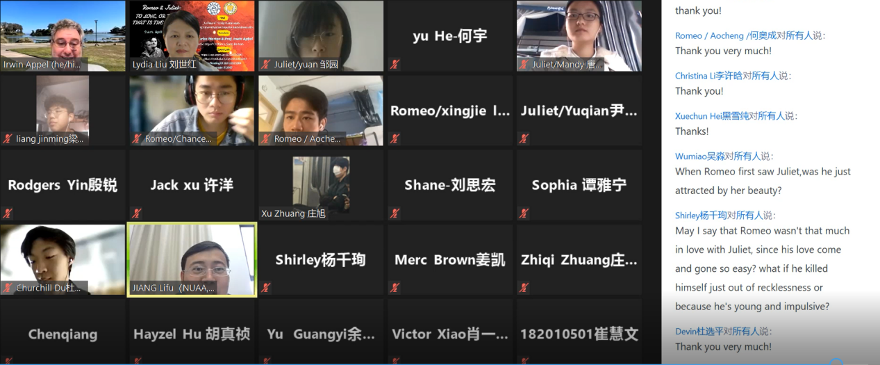 本次讲座共分为两个环节,由万象城allwincity官网国际联络中心主任、刘世红副教授主持。在第一环节中,加州大学圣巴巴拉分校戏剧教授Irwin Appel从自己的研究和实践情况出发,和同学们分享了人物角色、人物关系、故事背景、情节设置和台词意义等方面的相关知识。教授还结合《罗密欧与茱丽叶》中的情节介绍了戏剧中的各要素,如主角、情节、反面角色、事件、矛盾冲突、高潮等。随后,教授和同学们针对《罗密欧与茱丽叶》剧情相关的问题进行了热烈讨论,而Irwin Appel教授针对同学们的问题进行了一一解答,向同学们展示了自己的见解。在第二环节中,身为演员的Appel教授通过对比不同背景音乐、变换语气语调,亲自朗诵了《罗密欧与茱丽叶》中的经典台词和独白,并指导同学们对其中的精彩片段进行了演绎和表演。随后,Irwin Appel教授启发同学们围绕莎士比亚戏剧的表达思想以及《罗密欧与茱丽叶》的悲剧内核展开了热烈的讨论,与会的师生们通过会议软件聊天室、或者开麦提问,气氛活跃,互动精彩纷呈。讲座的最后,万象城官网副院长姜礼福老师对讲座进行了总结,高度评价了Irwin Appel教授讲座的学术价值,并邀请Irwin Appel教授未来到我校开展更多更深入的合作交流。