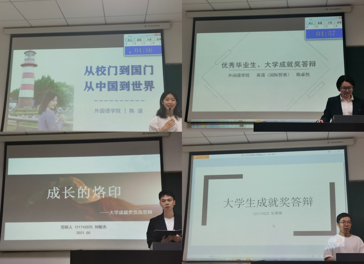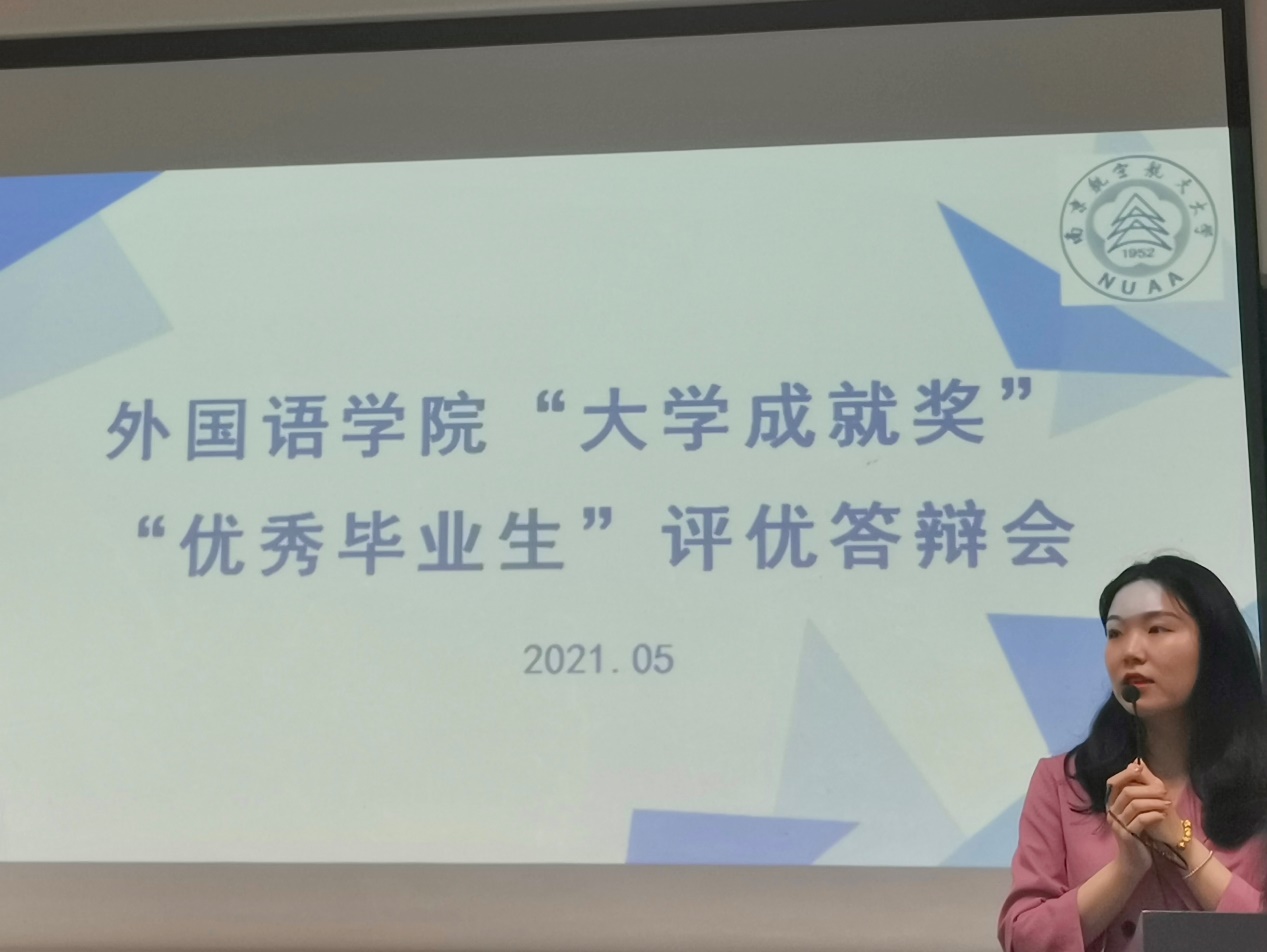 经前期学生自主申报、学院资格审核,共有7位毕业生同学参与本次答辩。陈诺连续四年绩点专业排名第一,积极参与国内外交流学习活动,致力于从校门走向国门、从中国走向世界;徐方忆积极参与活动比赛,脚踏实地、砥砺前行;陈卓然思考深入,致力于求真探索之路,不断提升、超越自我;张展旗奋发努力、坚持自我,在考研中取得优异成绩,以自身激励他人;刘敏杰参加各类竞赛,不断成长、不断进取,保研至北京外国语大学高级翻译学院;苏玥坚定学习信念,积极参加实习实践,用尝试去精彩;薛琬荷坚定艺术之路,开创南航首个合唱团,让世界听见南航的歌声。