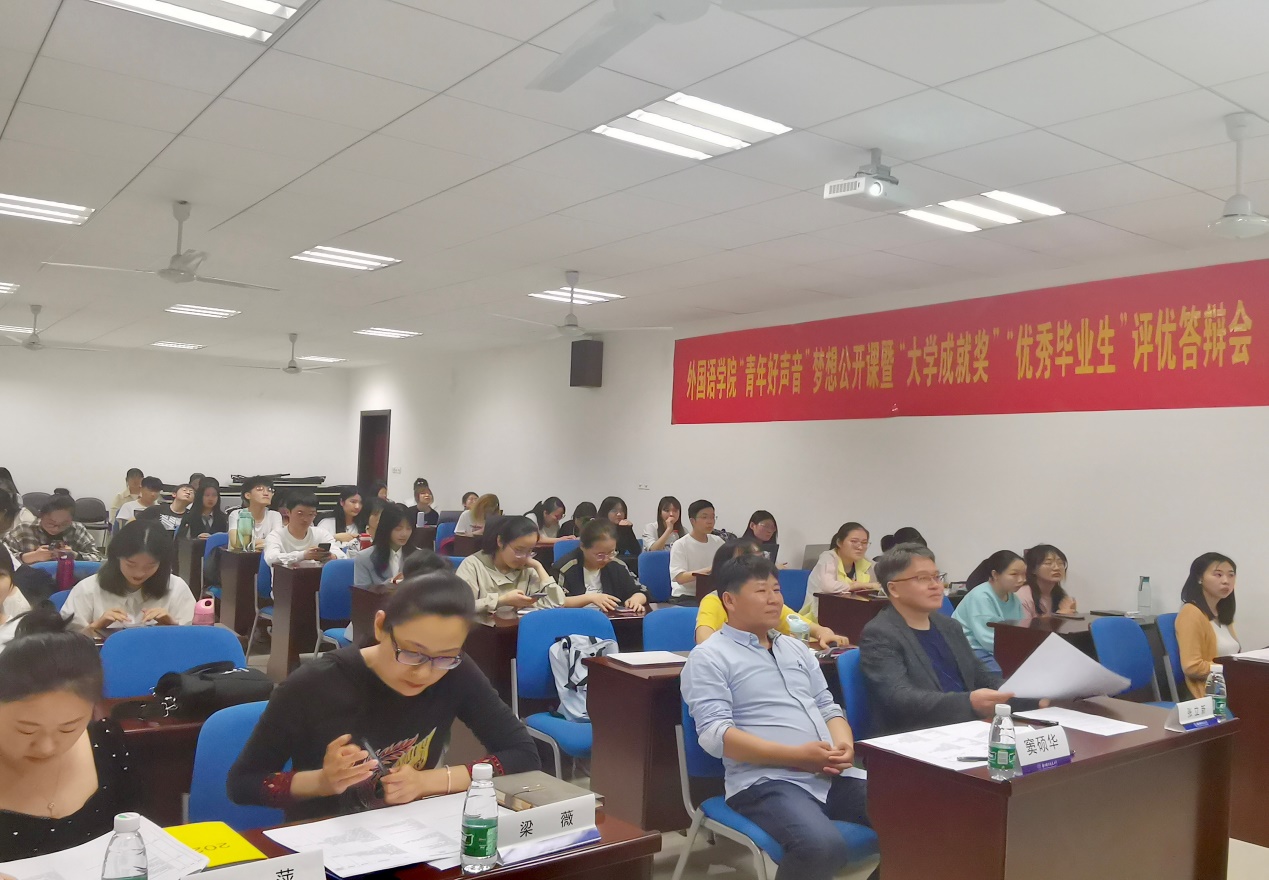 5月7日下午,万象城allwincity官网开展“青年好声音”梦想公开课暨“大学成就奖”、“优秀毕业生”评优答辩会。院党委副书记梁薇,英语系主任张立新,日语系主任窦硕华,院团委书记李萍,本科生辅导员盛嘉贤、彭欢作为评委参加了这次答辩,参加本次评优答辩会的还有各年级学生代表。