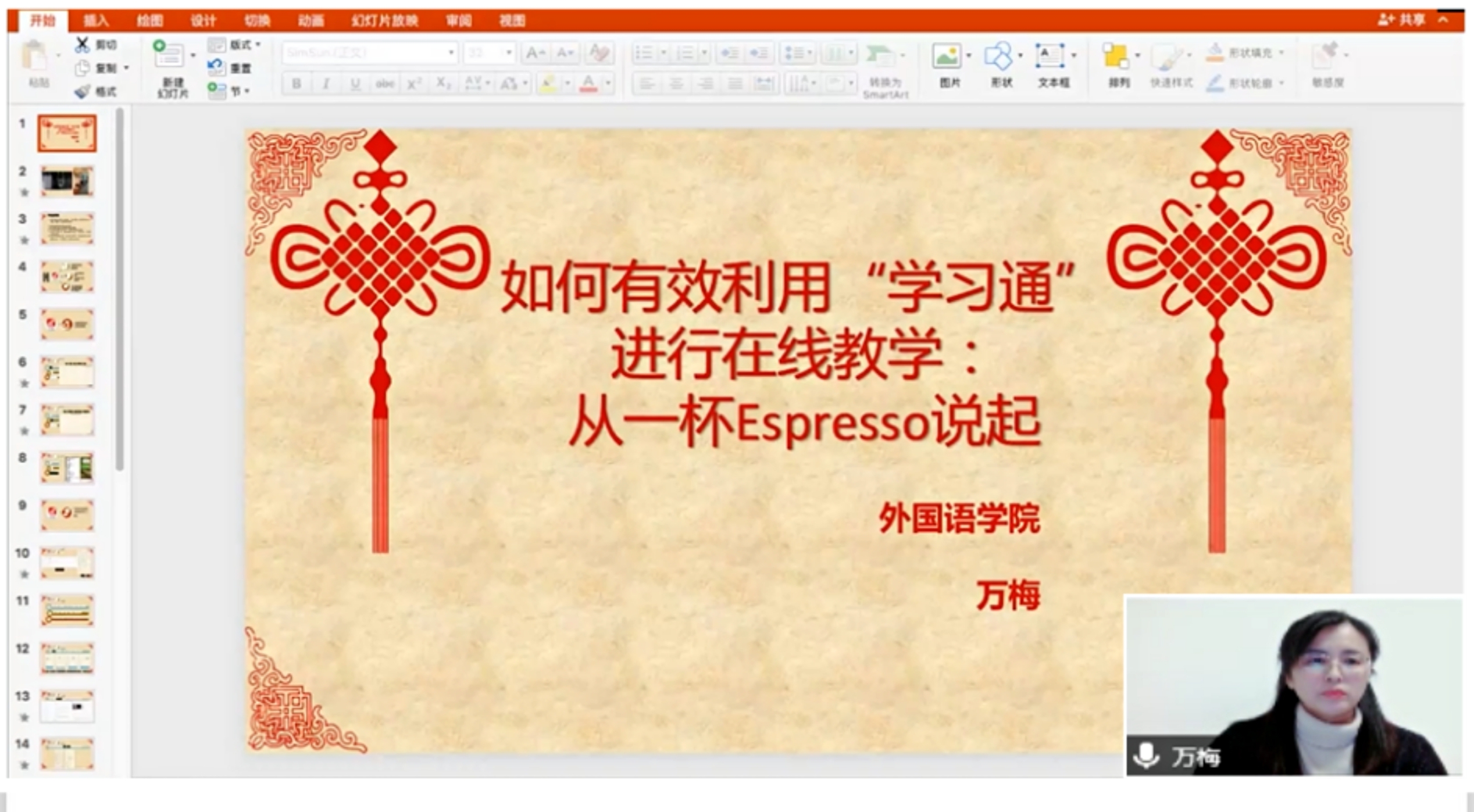 万梅老师以学习通使用为例,细致地分享了建课之后的在线教学经验,并介绍了参加在线教学竞赛的细节,她把教学比作制作咖啡,指出教师应该有效利用网络平台,精心设计教学,为学生呈现一杯浓缩Espresso,而不是掺了水的Americano。