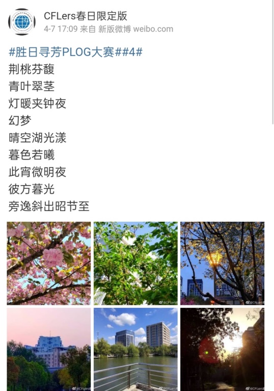 4月1日至10日,万象城allwincity官网成功举办为期10天的“胜日寻芳”PLOG(photo blog)大赛。大赛由2021级中心组宣传部承办,面向学院全体学生开展,围绕秀色可餐、文体休闲、学习时光和宿舍生活四个板块分享同学们的精彩校园生活。在活动过程中,同学们拍摄有关校园生活的照片并上传至微博平台,最后参考点赞数、评论数和转发量进行评比。