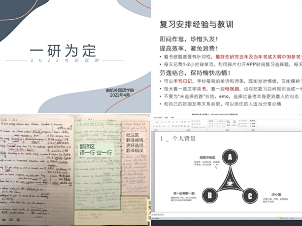 随着社会发展,考研大军也在不断壮大,很多同学也将考研纳入自身未来首选,针对如何备考,4月22日晚 “一研为定”考研经验分享会邀请了三位学姐为同学们答疑解惑。考入南航英语笔译专业的方菲从师资、个人情感等方面陈述选择南航的理由,并针对不同考试科目给出了相应的备考方法,并着重强调英语学科背诵单词的重要性;考入北航英语笔译专业的梁钰浛则详细介绍如何计算一个学校报录比及复录比,在备考科目中也给出了推荐的方法、老师、课程以及APP等;调剂至南京理工大学英语语言文学的甘雨珊首先分析了自己的性格,并依据自身特点安排了短时高效率的学习方法,她强调考研是一个长期战役,要时刻坚定信念,不要松懈。最后,在提问环节中,三位学姐就同学们提出的问题进行了细心解答。