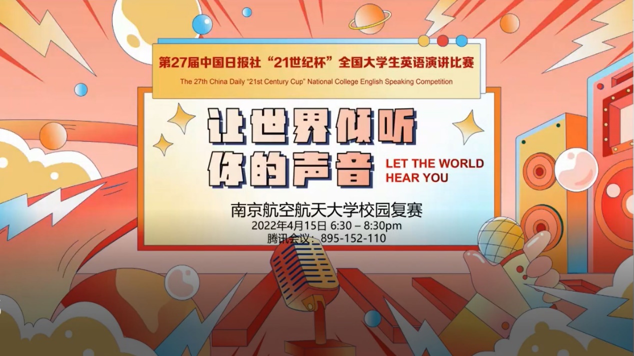 二十一世纪,是高科技迅猛发展的时代,也是国际交流更加频繁的时代,人类命运共同体思想指导我们要不断提高学生的英语水平从而深化中国在未来国际交流中的地位。值此疫情全球范围内大肆蔓延之际,为了加强我校英语学科建设,激发我校广大学生学习英语的热情,提高学生英语口语水平,营造良好英语学习氛围,为更多的同学提供一个尽情挥洒创意、展现自我风采的舞台,我校万象城allwincity官网响应主办方要求,积极承办了第27届“21世纪杯”全国大学生英语演讲比赛南航校园选拔赛,经过初赛选拔后,共有15名选手脱颖而出进入选拔赛复赛,由于疫情原因,复赛于2022年4月15日在腾讯会议平台以线上方式举行。