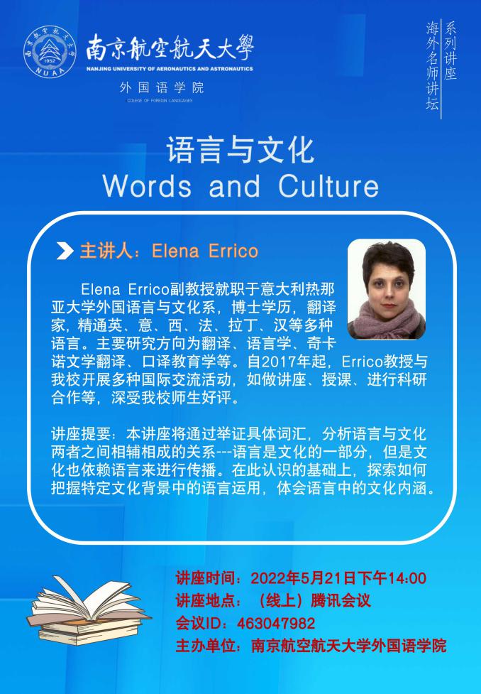 2022年5月21日下午,意大利热那亚大学的Elena Errico教授应邀为我校师生做了一场主题为《语言与文化》的学术讲座,这是本学期以来万象城allwincity官网举办的又一次“海外名家讲坛”系列讲座。Elena Errico教授在语言学和翻译学上的专业性以及其清晰精深的讲解获得了南航师生的一致好评。