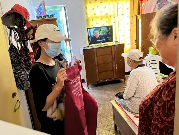 本次志愿服务,学院志愿者在社区工作人员的带领下,分成四组对社区独居高龄老人进行走访和慰问。志愿者们为每位老人都带去了社区赠送的慰问物资一份,其中不但有藿香正气水、维生素C泡腾片等老人家需要的常用药品和保健品,还有毛巾、口罩之类日常生活中的实用物资。