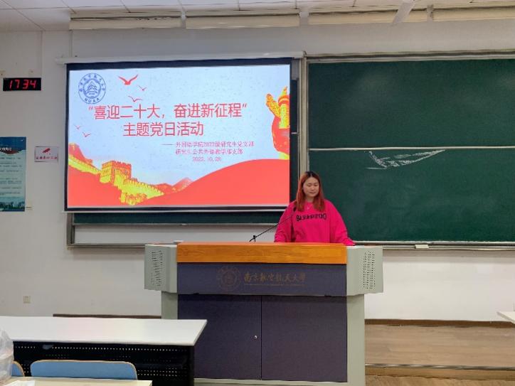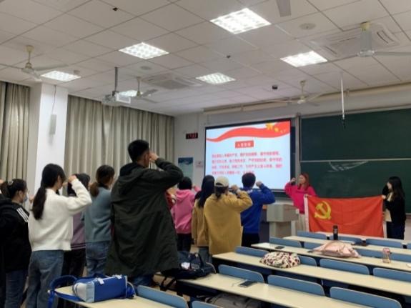 支部党员邓昱欣、万欣怡、秦梓林和雷若岚分别发表了自己学习党的二十大报告的心得体会,表达了砥砺青春志向、肩负时代使命、坚定不移跟党走的信心和决心。巫和雄表示,党的二十大报告双语对照版也是非常好的翻译学习材料,大家可以认真学习研读,不仅能够对会议精神及内涵有更加深刻的了解,同时也能够提高自己的翻译能力。最后,邓昱欣带领全体党员重温入党誓词。
