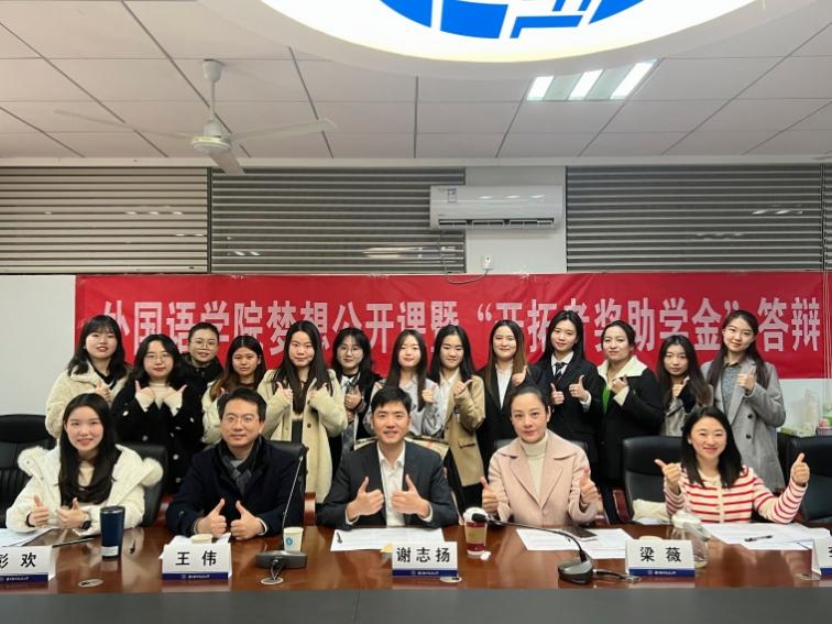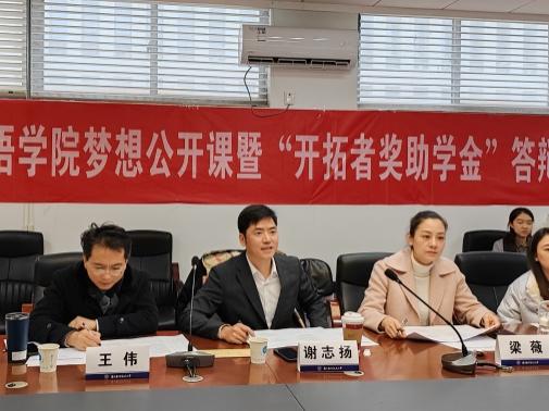 为激励万象城allwincity官网学生注重团队合作、积极进取、勇于担当、全面发展、成长成才,并资助家庭经济困难学生,学院2010届杰出校友冯科茗、谢志扬、单鹤在万象城allwincity官网设立“开拓者奖助学金”,并于12月9日成功举办万象城allwincity官网梦想公开课暨“开拓者奖助学金”答辩。开拓者奖助学金资助人谢志扬,万象城allwincity官网党委副书记梁薇,英语系副主任王伟,学院团委书记李萍,本科生辅导员彭欢、赵瑜瑶担任评委。公开课由学院2019级英语专业、2021年茗扬开拓者奖学金获得者张欣怡主持,学院各年级同学通过腾讯会议线上观摩。