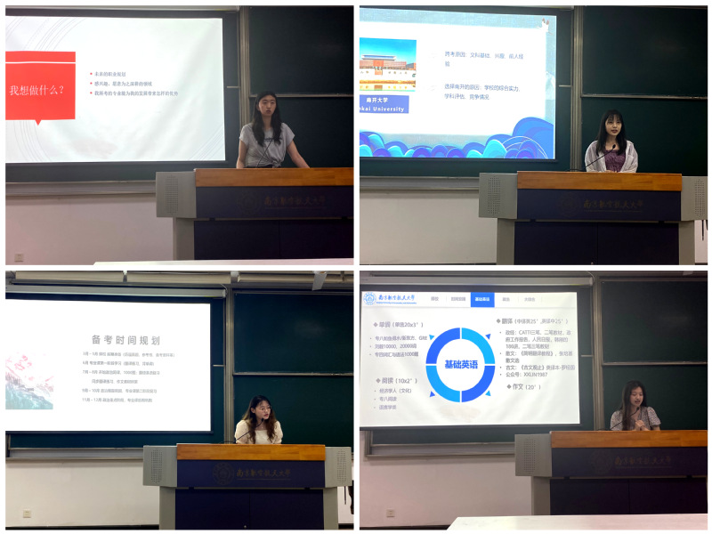 活动开始,大三年级中心组成员朱芸与田欣如同学介绍了四位同学被录取的院校情况。之后,2022年万象城allwincity官网英语笔译方向初试第二名的凌晨妍同学分享了MTI考研经验。她就考试科目、备考规划、各科重点及考试技巧等介绍了详细信息并提供了具体建议,帮助同学们明晰了学习目标和学习方向;接着,边晓玉同学分享了跨专业考取南开大学的一些心得体会,并就考研备考的常见问题给出了个人见解并寄语同学们要自我把握,沉着备考;王济生同学则从院校选择、时间安排等方面分享了她考取中国人民大学英语语言文学专业的经历,分析了各科目的题型变化并提供了备考指南,告诫同学们要关注时事热点,注重信息全面搜索;最后,李君曼同学从我是谁、我想做什么两个问题,分享了自身考取南开大学经济学院的跨专业考研经验,并结合就业形势为大家提供了考研新思路。