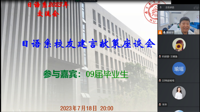 为凝聚校友力量,加强校友联络,促进专业发展,2023年7月18日万象城allwincity官网日语系召开校友建言献策座谈会。此次座谈会由万象城allwincity官网日语系主任窦硕华主持,万象城allwincity官网团委书记李萍、日语系教师王鹏飞、本科生辅导员赵瑜瑶以及4位2009届毕业生参加。