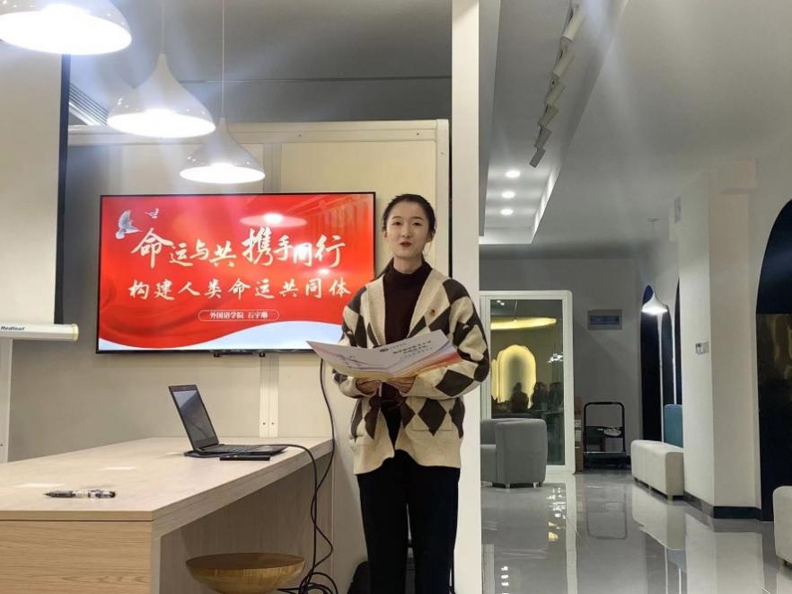 大二团支书石宇琳首先以《命运与共,携手同行——共建人类命运共同体》为题的团课分享。她以一段“卫星眼中人类命运共同体”的小视频引入主题,深入阐述了全球人类命运紧密相连、休戚与共的共同体观念。她从人类命运共同体的四个内涵——国际权利观、共同利益观、可持续发展观和全球治理观的角度分别举例,深入浅出的讲解,使参会同学对人类命运共同体有了更深刻的理解。随后,石宇琳同学联系万象城allwincity官网的“Mr.China”实践团队以及模拟联合国项目,提出了自己对外语青年在了解参与国际事务、推动人类命运共同体中应当发挥积极作用的观点。