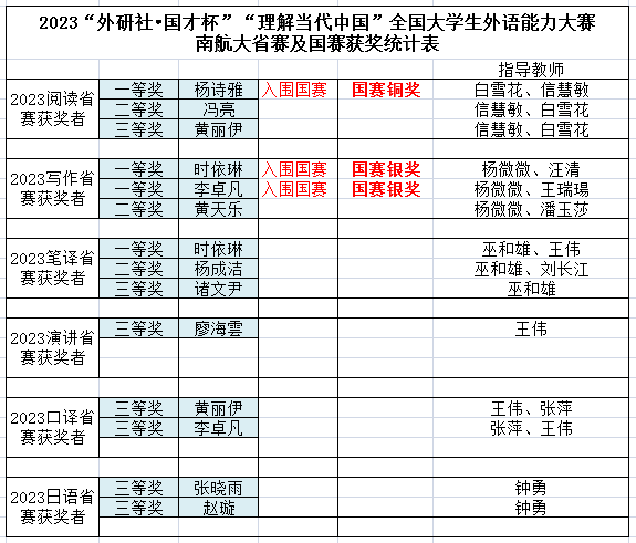 近日,2023年外研社国才杯“理解当代中国”全国大学生外语能力系列大赛落下帷幕,我校选手在万象城官网竞赛团队教师的精心组织和指导下取得了骄人的成绩,其中全国总决赛3项获奖,江苏省复赛获奖14项。