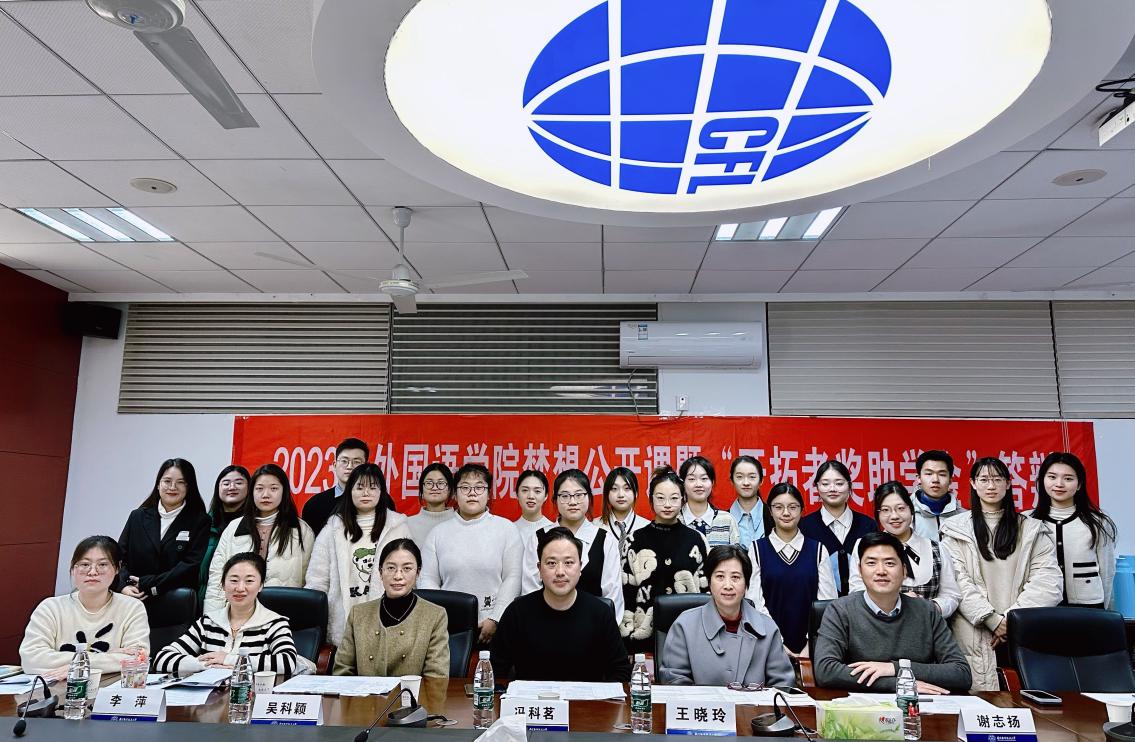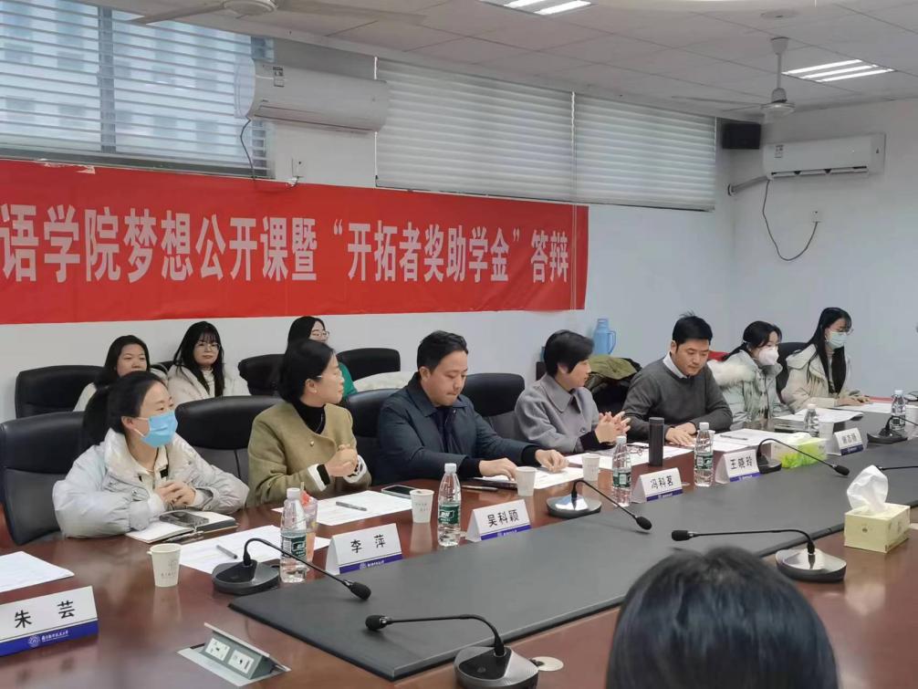 为激励万象城allwincity官网学生注重团队合作、积极进取、勇于担当、全面发展、成长成才,并资助家庭经济困难学生,自2020年起学院2010届优秀院友冯科茗、谢志扬、单鹤设立“开拓者奖助学金”。12月15日万象城allwincity官网举办梦想公开课暨“开拓者奖助学金”答辩。开拓者奖助学金资助人谢志扬、冯科茗,英语系教师代表王晓玲老师,万象城allwincity官网党委副书记吴科颖,英语系主任张立新,学院团委书记李萍,本科生辅导员彭欢、赵瑜瑶、朱芸担任评委。本次公开课由学院2020级英语专业、2022年开拓者奖学金一等奖获得者朱睿主持。