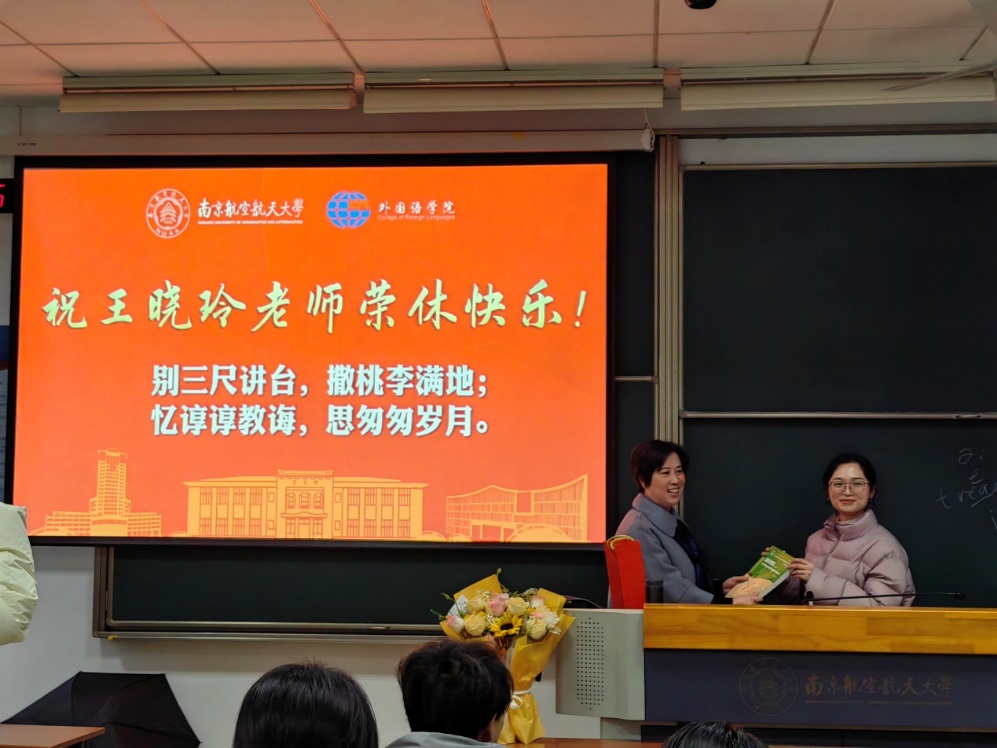 此外,开拓者奖助学金中有一项特别的奖学金,为“王晓玲老师特别奖”。今天也正值王晓玲老师执教生涯最后一课。临别之际,学院教师代表及大二英语系的同学们共同为王晓玲老师举办了荣休仪式。别三尺讲台,撒桃李遍地,在36年执教生涯的最后,王晓玲老师表达了对英语专业教学的热忱、对英语学科发展的关注、对万象城allwincity官网的不舍。“Be more prosperous in your study and career!”道出了王老师对莘莘学子们的美好祝愿与殷切期望。