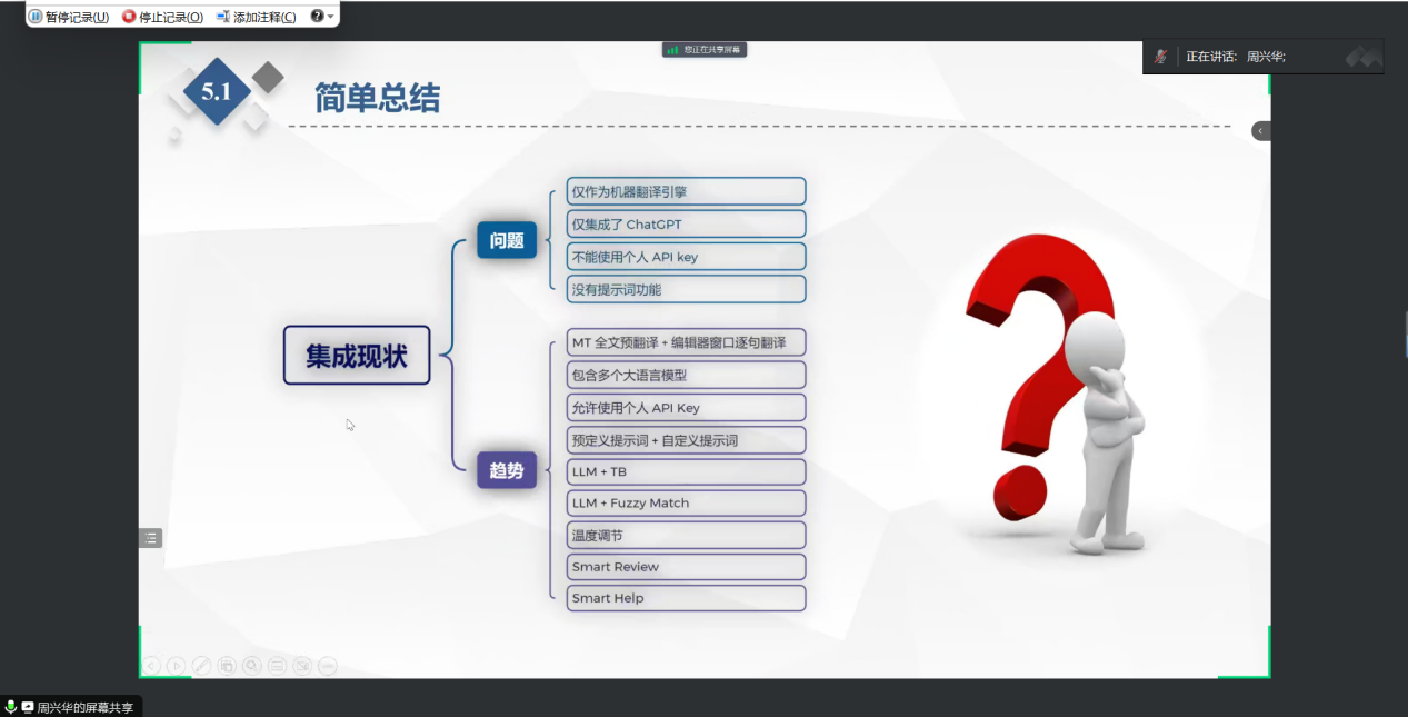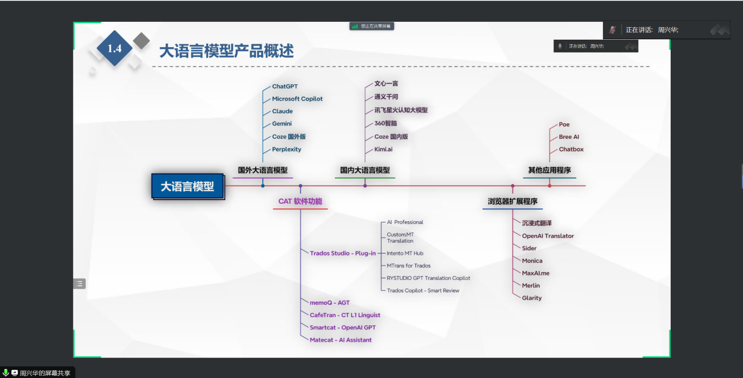 如今,人工智能的时代大势引发了深刻的技术革命、教育变革和数据革命,同时翻译技术也成为了翻译教学和实践中不可分割的部分,进一步推动了语言服务行业和高校教育的创新变革,促进了技术与人的和谐共生。为提升语言服务行业各方对翻译技术的认识和应用能力,加强语言服务人才的技术素养,加速语言技术成果的高效转化,2024年4月1日晚,南航万象城allwincity官网MTI教育中心邀请了翻译技术专家周兴华老师给2023级研究生带来了极具前沿特色的一堂翻译技术课。本次课程,周老师给大家带来了大语言模型与CAT软件的集成及实践应用系列课程,侧重分析和探讨了其应用优势与应用场景。