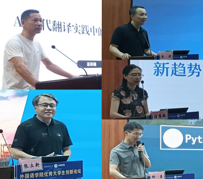 姜礼福首先进行了招生宣讲,详细介绍了院校建设、招生专业、师资力量以及培养质量,鼓励全国优秀学子加强同南航外院开展交流。随后,巫和雄、张立新、朱波、信慧敏和钟勇分别作了题为“AI时代翻译实践中的‘人’性诉求”、“学科交叉前沿:从语言学到区域国别学”、“口述影像理论与实践——以日航123号事件为例”、“21世纪外国文学研究新趋势”和“Python加持下的语言数字人文实践”的报告。